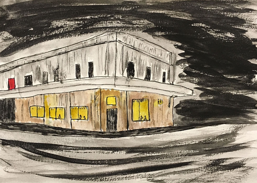 First bash with water soluble ink. Wasn't as soluble as I'd like it to be but there you go. Ah yes and a red light. Didn't notice it was that sort of district when I took the reference photo, and maybe it was just a coincidence. Or maybe not, after all, it was Freo By Night.